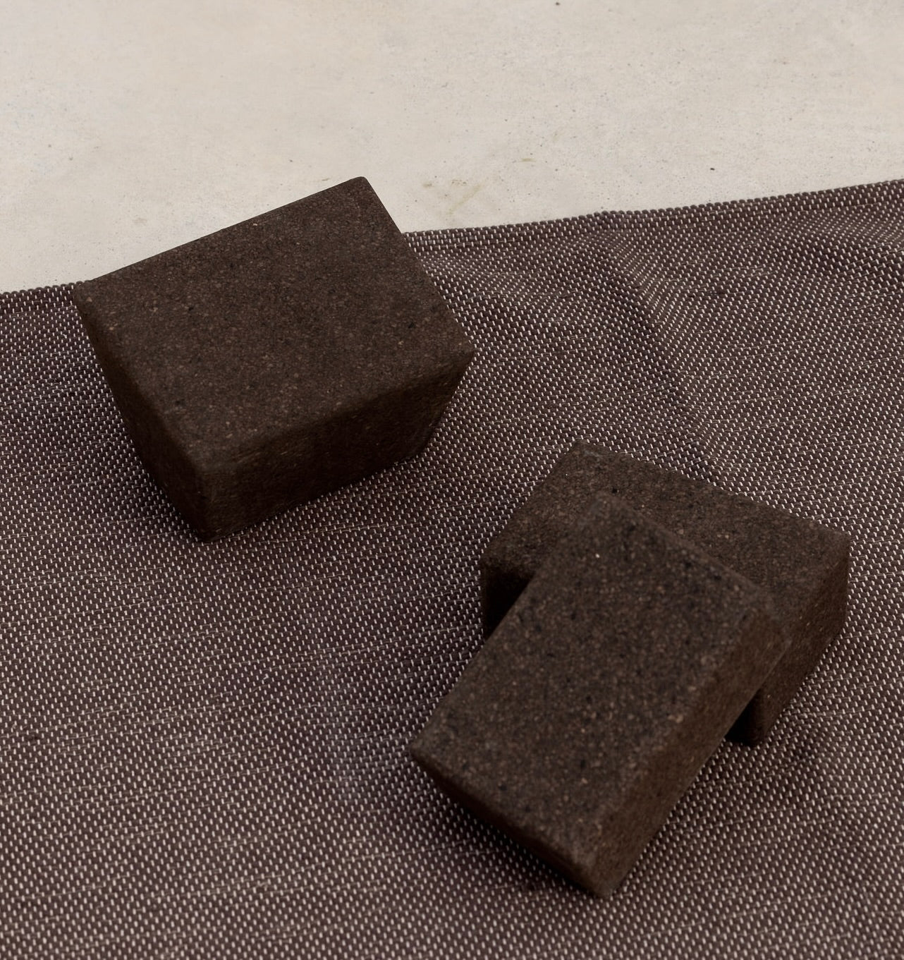 Three rolled up natural cork mats of black, brown, and beige with a cork block against a stone. Three cork mats against a stone wall  #color_earth